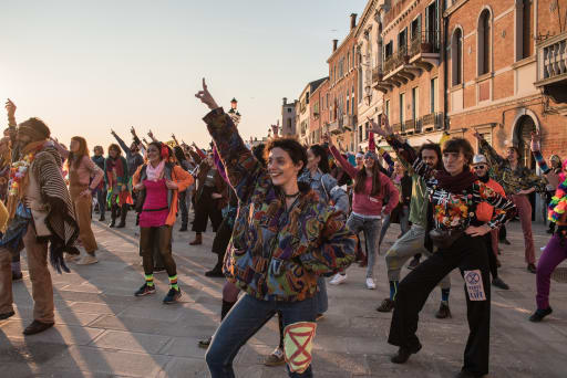 I cartelli con slogan come “Quanti carnevali ci restano?” o “niente carnevale in fondo al mare” hanno veicolato il messaggio dei ribelli con un contrasto rispetto all’allegria della musica e all’energia dei passi coordinati. I tre flashmob si sono svolti in strada Nuova, campo Santi Apostoli e alle zattere per tutto il pomeriggio.