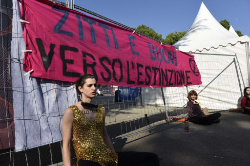 Torino, 11 maggio 2022 – Attivisti di Extinction Rebellion, travestiti da Maneskin, si sono incatenati alle grate dell'ingresso dell’Eurovillage. “Zitti e buoni verso l’estinzione”