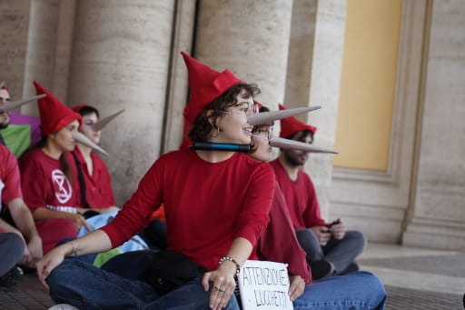 Sono un centinaio gli attivisti di Extinction Rebellion che questa mattina, travestiti da Pinocchio, hanno bloccato l'ingresso del Ministero delle Infrastrutture e dei Trasporti. Indossando il proverbiale naso lungo del burattino di Collodi, alcuni attivisti si sono incatenati alle porte d’ingresso, mentre altri si sono appesi con corde, imbrago e caschetto, sui pali della luce. “Crisi climatica: benvenuti nel Governo dei Balocchi" si legge sullo striscione all’ingresso. Nel piazzale antistante è stato inoltre montato un grosso Pinocchio di cartapesta, seduto su due barili di petrolio mentre regge in mano la terra in fiamme.