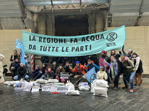 Torino, 10/12/2024 - Extinction Rebellion scarica sacchi anti allagamento all’ingresso del Consiglio Regionale del Piemonte, poco prima della discussione sul Piano di Qualità dell’Aria. “La Regione fa acqua da tutte le parti” si legge sullo striscione, in riferimento alla mancanza di politiche climatiche strutturali, nonostante il Piemonte e l’Italia siano state colpite da alluvioni sempre più intense