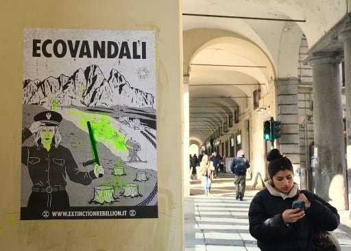 Questa mattina chi ha attraversato il centro città per recarsi al lavoro si è trovato di fronte a grandi poster con l’immagine di Giorgia Meloni in divisa da poliziotta, con in mano il manganell, e sullo sfondo la frana di Niscemi o le piste da sci di Cortina. Un messaggio completato da una spennellata di verde fluo e la scritta “Ecovandali!”. Un modo ironico e provocatorio con cui Extinction Rebellion riporta l’attenzione “sui veri ecovandali, su un Governo che investe miliardi in opere ecocide, come i 14 per il ponte sullo Stretto o i 7 per le Olimpiadi di Milano - Cortina, abbandonando i territori e i loro abitanti alla furia di un clima impazzito. E che da tre anni sfrutta fatti di cronaca per diffondere un senso di insicurezza, aumentare i reati e ridurre gli spazi democratici per esprimere dissenso, criminalizzando chiunque protesti” riporta il movimento.